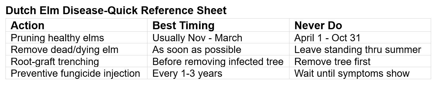 3. Prompt removal of dying or recently dead elms. Dead elms are beetle breeding factories. Remove and destroy (chip, burn, or bury) within weeks of death, especially April–September. Debark logs if you must store them.