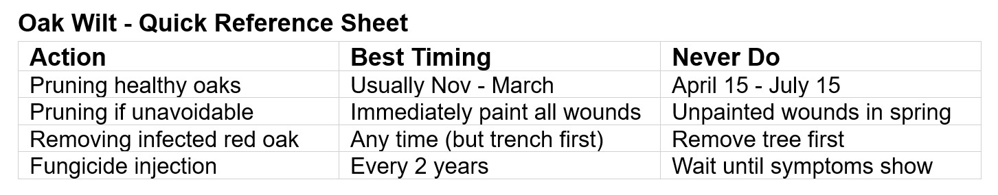By following these steps - especially the “no wounding in spring/summer” rule and proper root-graft disruption - you can dramatically reduce the chances of oak wilt establishing or spreading on your property. If you suspect oak wilt (rapid leaf browning/discoloration starting at the top in pin oaks or red oaks, call an ISA