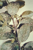 Male scales are small, slender, and chalky-white. Females are pear shaped, brown, and about twice the size of males. Euonymous scale is found on all varieties of Euonymous, and will infest a few other types of shrubs. The insect attacks both stems and leaves. Stems often become so heavily encrusted with scales that they appear white. Shrubs can be killed if scale is not controlled.