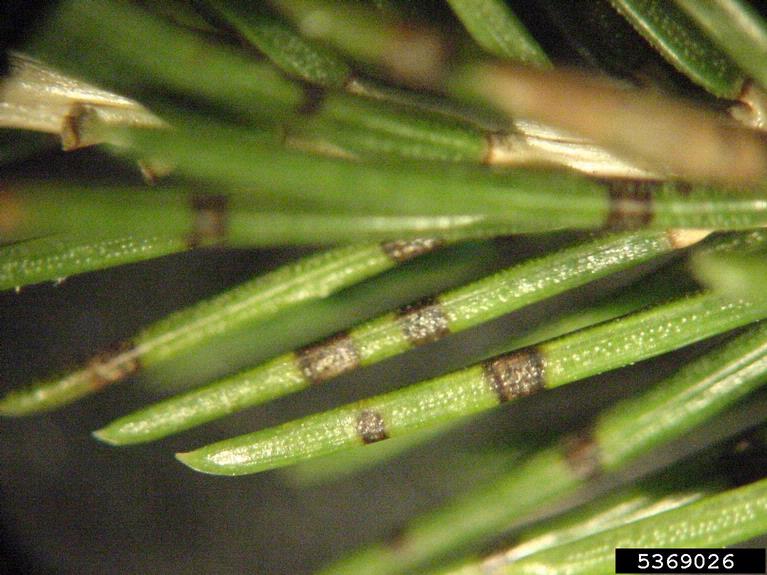 Banding on pine needles from Dothistroma Needle Blight. Photo: Paul Bachi, Univ. of Kentucky, Bugwood.org