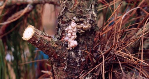 The Zimmerman pine moth will attack many species of pine common to Michigan, including Austrian, Jack, and Scots pine. Stressed trees are most susceptible. The first sign of infestation by the Zimmerman Pine Moth is the appearance of small, reddish pitch masses. The pitch masses are usually found where branches join the main stem. The pitch mass is the result of a larva boring through the bark into the sapwood to feed. Additional pitch bleeds from the tree as larvae continue to tunnel and feed beneath the bark. The pitch masses eventually turn light yellow to off-white. Trees showing only this sign have probably been infested for only one or two years. Pitch masses may go unnoticed unless the trees are closely examined.